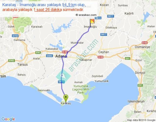 Karataş - İmamoğlu arası yaklaşık olarak 90 km/h ile yukarıda belirtilen sürede olup, iki yerin kuş uçuşu uzaklığı (mesafesi) 80'dir. Yolculuk otobüsle 1 saat 51 dakika sürmektedir.