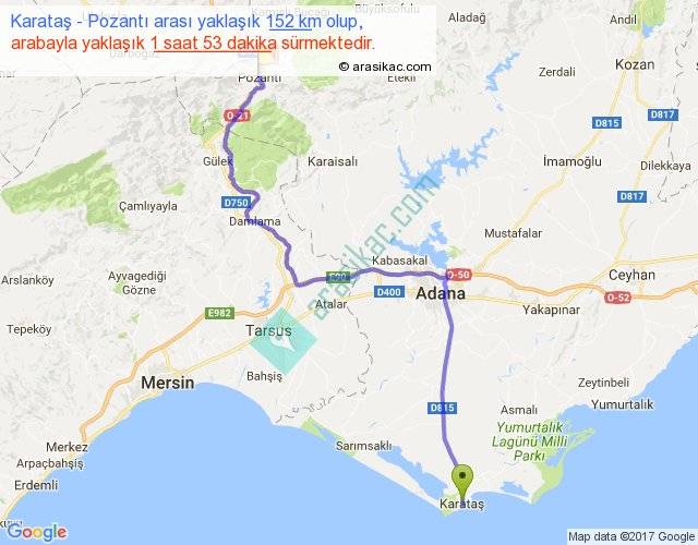 Karataş - Pozantı arası yaklaşık olarak 90 km/h ile yukarıda belirtilen sürede olup, iki yerin kuş uçuşu uzaklığı (mesafesi) 105'dir. Yolculuk otobüsle 2 saat 25 dakika sürmektedir.