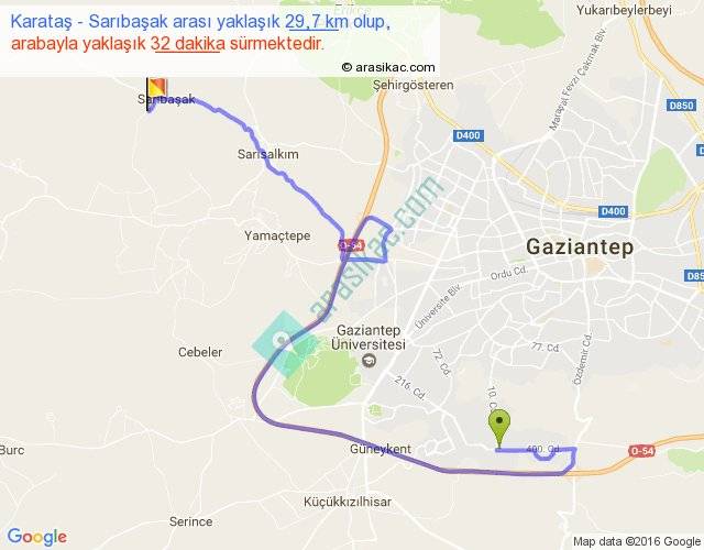 Karataş - Sarıbaşak arası yaklaşık olarak 90 km/h ile yukarıda belirtilen sürede olup, iki yerin kuş uçuşu uzaklığı (mesafesi) 13'dir. Yolculuk otobüsle 41 dakika sürmektedir.