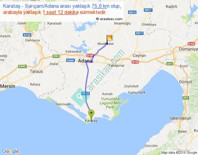 Karataş - Sarıçam Adana arası yaklaşık olarak 90 km/h ile yukarıda belirtilen sürede olup, iki yerin kuş uçuşu uzaklığı (mesafesi) 61'dir. Yolculuk otobüsle 1 saat 33 dakika sürmektedir.