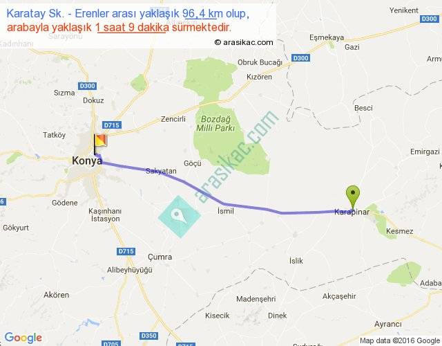 Karatay Sk. - Erenler arası yaklaşık olarak 90 km/h ile yukarıda belirtilen sürede olup, iki yerin kuş uçuşu uzaklığı (mesafesi) 92'dir. Yolculuk otobüsle 1 saat 29 dakika sürmektedir.