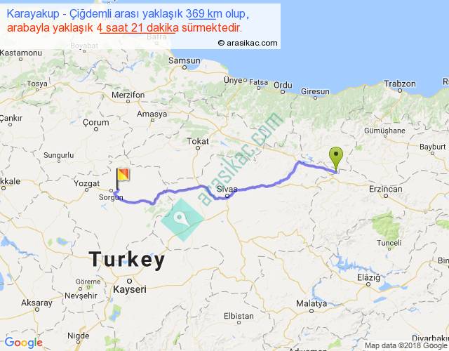 Karayakup - Çiğdemli arası yaklaşık olarak 90 km/h ile yukarıda belirtilen sürede olup, iki yerin kuş uçuşu uzaklığı (mesafesi) 290'dir. Eğer belirtilen yerler arasında uçak seferi var ise bu süre uçakla 26 dakika'ya kadar düşebilir. Yolculuk otobüsle 5 saat 39 dakika sürmektedir.