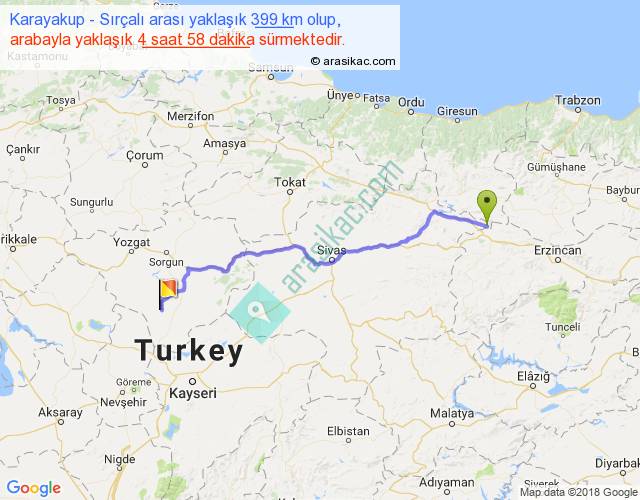 Karayakup - Sırçalı arası yaklaşık olarak 90 km/h ile yukarıda belirtilen sürede olup, iki yerin kuş uçuşu uzaklığı (mesafesi) 314'dir. Eğer belirtilen yerler arasında uçak seferi var ise bu süre uçakla 28 dakika'ya kadar düşebilir. Yolculuk otobüsle 6 saat 27 dakika sürmektedir.