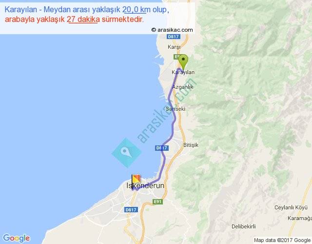 Karayılan - Meydan arası yaklaşık olarak 90 km/h ile yukarıda belirtilen sürede olup, iki yerin kuş uçuşu uzaklığı (mesafesi) 16'dir. Yolculuk otobüsle 35 dakika sürmektedir.