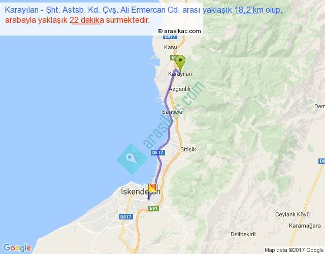 Karayılan - Şht. Astsb. Kd. Çvş. Ali Ermercan Cd. arası yaklaşık olarak 90 km/h ile yukarıda belirtilen sürede olup, iki yerin kuş uçuşu uzaklığı (mesafesi) 16'dir. Yolculuk otobüsle 28 dakika sürmektedir.
