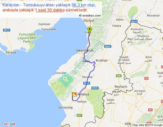 Karayılan - Tomruksuyu arası yaklaşık olarak 90 km/h ile yukarıda belirtilen sürede olup, iki yerin kuş uçuşu uzaklığı (mesafesi) 64'dir. Yolculuk otobüsle 1 saat 57 dakika sürmektedir.