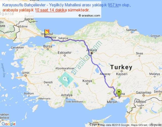 Karayusuflu Bahçelievler - Yeşilköy Mahallesi arası yaklaşık olarak 90 km/h ile yukarıda belirtilen sürede olup, iki yerin kuş uçuşu uzaklığı (mesafesi) 715'dir. Eğer belirtilen yerler arasında uçak seferi var ise bu süre uçakla 1 saat 06 dakika'ya kadar düşebilir. Yolculuk otobüsle 13 saat 18 dakika sürmektedir.