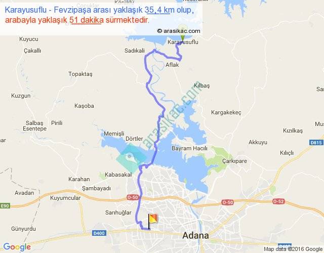 Karayusuflu - Fevzipaşa arası yaklaşık olarak 90 km/h ile yukarıda belirtilen sürede olup, iki yerin kuş uçuşu uzaklığı (mesafesi) 23'dir. Yolculuk otobüsle 1 saat 6 dakika sürmektedir.