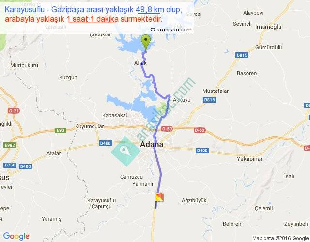 Karayusuflu - Gazipaşa arası yaklaşık olarak 90 km/h ile yukarıda belirtilen sürede olup, iki yerin kuş uçuşu uzaklığı (mesafesi) 39'dir. Yolculuk otobüsle 1 saat 19 dakika sürmektedir.