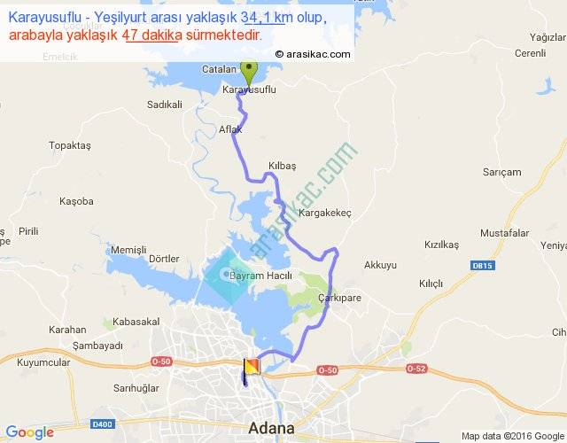 Karayusuflu - Yeşilyurt arası yaklaşık olarak 90 km/h ile yukarıda belirtilen sürede olup, iki yerin kuş uçuşu uzaklığı (mesafesi) 20'dir. Yolculuk otobüsle 1 saat 1 dakika sürmektedir.