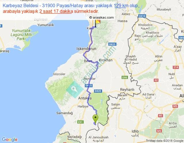 Karbeyaz Beldesi - 31900 Payas Hatay arası yaklaşık olarak 90 km/h ile yukarıda belirtilen sürede olup, iki yerin kuş uçuşu uzaklığı (mesafesi) 83'dir. Yolculuk otobüsle 2 saat 58 dakika sürmektedir.