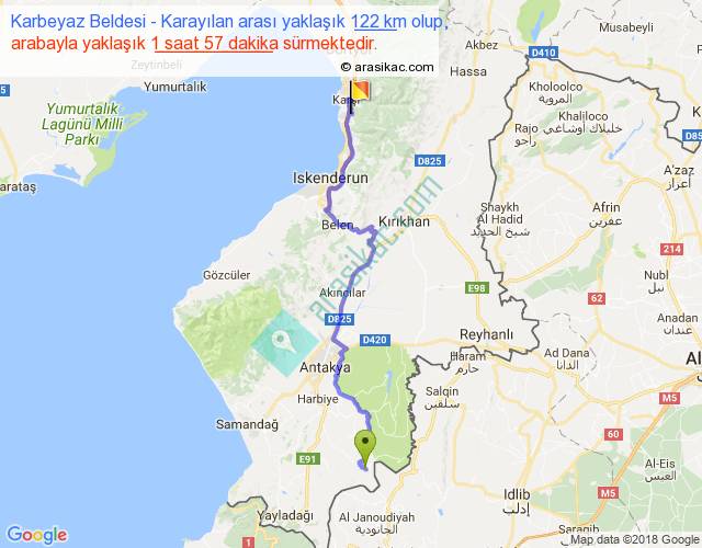 Karbeyaz Beldesi - Karayılan arası yaklaşık olarak 90 km/h ile yukarıda belirtilen sürede olup, iki yerin kuş uçuşu uzaklığı (mesafesi) 79'dir. Yolculuk otobüsle 2 saat 32 dakika sürmektedir.