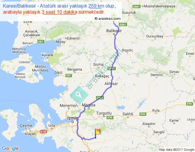 Karesi Balıkesir - Atatürk arası yaklaşık olarak 90 km/h ile yukarıda belirtilen sürede olup, iki yerin kuş uçuşu uzaklığı (mesafesi) 180'dir. Yolculuk otobüsle 4 saat 7 dakika sürmektedir.