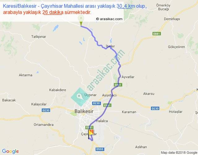 Karesi Balıkesir - Çayırhisar Mahallesi arası yaklaşık olarak 90 km/h ile yukarıda belirtilen sürede olup, iki yerin kuş uçuşu uzaklığı (mesafesi) 21'dir. Yolculuk otobüsle 33 dakika sürmektedir.