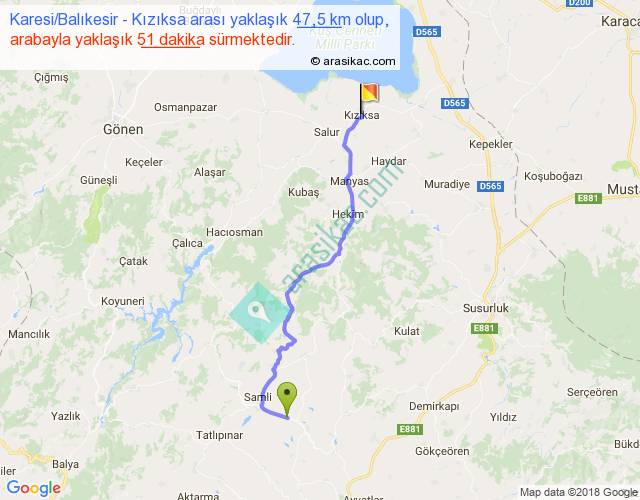 Karesi Balıkesir - Kızıksa arası yaklaşık olarak 90 km/h ile yukarıda belirtilen sürede olup, iki yerin kuş uçuşu uzaklığı (mesafesi) 36'dir. Yolculuk otobüsle 1 saat 6 dakika sürmektedir.
