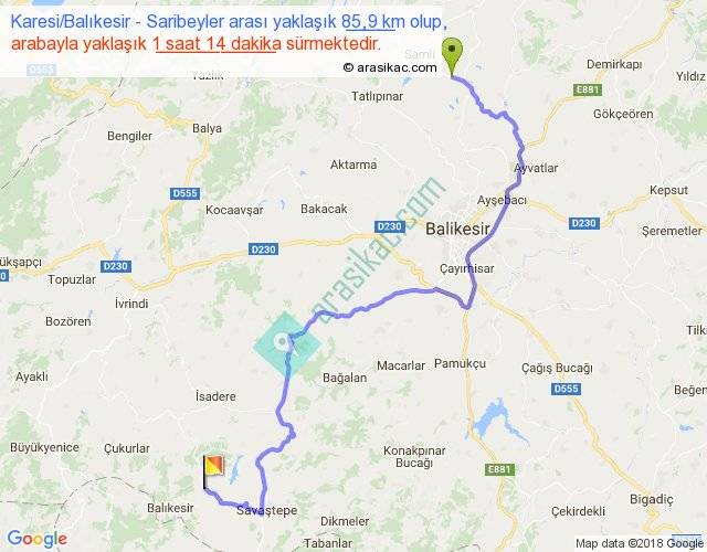 Karesi Balıkesir - Saribeyler arası yaklaşık olarak 90 km/h ile yukarıda belirtilen sürede olup, iki yerin kuş uçuşu uzaklığı (mesafesi) 51'dir. Yolculuk otobüsle 1 saat 36 dakika sürmektedir.