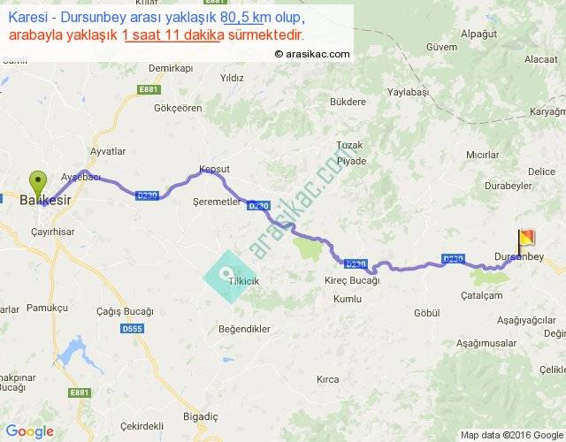 Karesi - Dursunbey arası yaklaşık olarak 90 km/h ile yukarıda belirtilen sürede olup, iki yerin kuş uçuşu uzaklığı (mesafesi) 64'dir. Yolculuk otobüsle 1 saat 32 dakika sürmektedir.