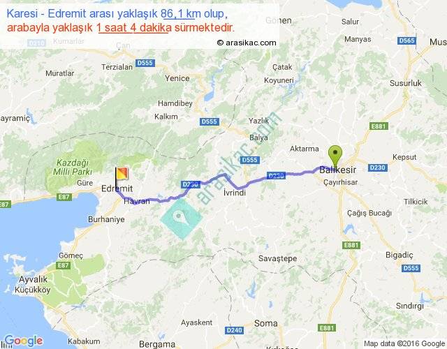 Karesi - Edremit arası yaklaşık olarak 90 km/h ile yukarıda belirtilen sürede olup, iki yerin kuş uçuşu uzaklığı (mesafesi) 73'dir. Yolculuk otobüsle 1 saat 23 dakika sürmektedir.