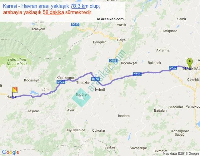 Karesi - Havran arası yaklaşık olarak 90 km/h ile yukarıda belirtilen sürede olup, iki yerin kuş uçuşu uzaklığı (mesafesi) 67'dir. Yolculuk otobüsle 1 saat 15 dakika sürmektedir.