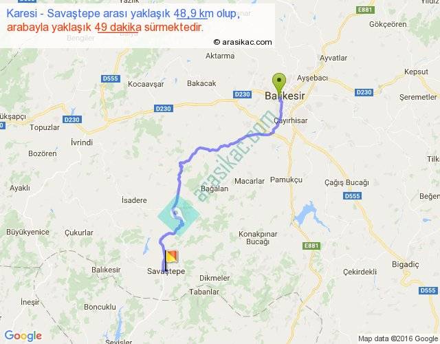 Karesi - Savaştepe arası yaklaşık olarak 90 km/h ile yukarıda belirtilen sürede olup, iki yerin kuş uçuşu uzaklığı (mesafesi) 35'dir. Yolculuk otobüsle 1 saat 3 dakika sürmektedir.