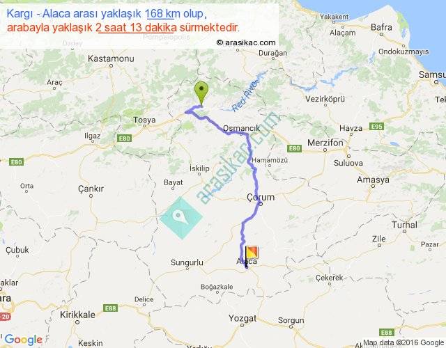 Kargı - Alaca arası yaklaşık olarak 90 km/h ile yukarıda belirtilen sürede olup, iki yerin kuş uçuşu uzaklığı (mesafesi) 111'dir. Yolculuk otobüsle 2 saat 52 dakika sürmektedir.