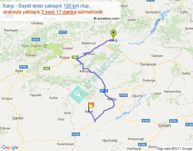 Kargı - Bayat arası yaklaşık olarak 90 km/h ile yukarıda belirtilen sürede olup, iki yerin kuş uçuşu uzaklığı (mesafesi) 384'dir. Eğer belirtilen yerler arasında uçak seferi var ise bu süre uçakla 35 dakika'ya kadar düşebilir. Yolculuk otobüsle 6 saat 48 dakika sürmektedir.