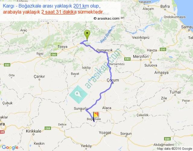 Kargı - Boğazkale arası yaklaşık olarak 90 km/h ile yukarıda belirtilen sürede olup, iki yerin kuş uçuşu uzaklığı (mesafesi) 123'dir. Yolculuk otobüsle 3 saat 16 dakika sürmektedir.