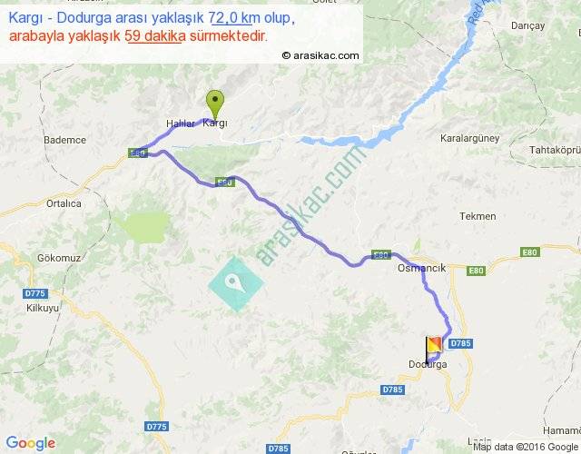 Kargı - Dodurga arası yaklaşık olarak 90 km/h ile yukarıda belirtilen sürede olup, iki yerin kuş uçuşu uzaklığı (mesafesi) 41'dir. Yolculuk otobüsle 1 saat 16 dakika sürmektedir.