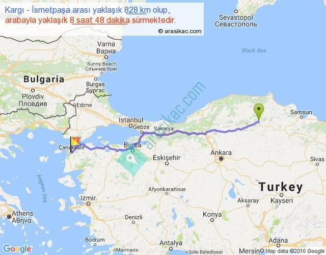 Kargı - İsmetpaşa arası yaklaşık olarak 90 km/h ile yukarıda belirtilen sürede olup, iki yerin kuş uçuşu uzaklığı (mesafesi) 685'dir. Eğer belirtilen yerler arasında uçak seferi var ise bu süre uçakla 1 saat 03 dakika'ya kadar düşebilir. Yolculuk otobüsle 11 saat 26 dakika sürmektedir.