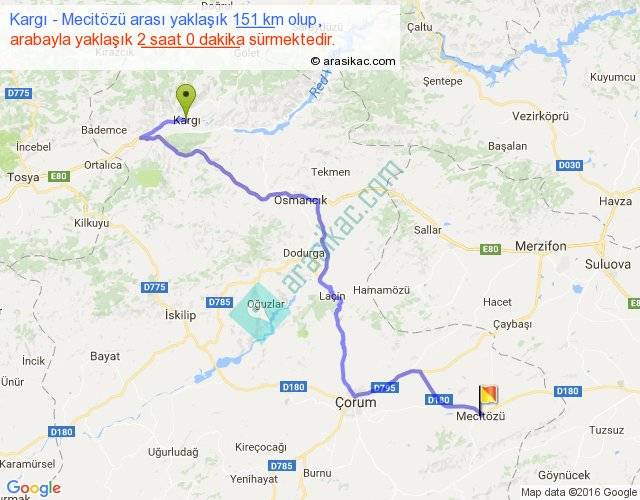 Kargı - Mecitözü arası yaklaşık olarak 90 km/h ile yukarıda belirtilen sürede olup, iki yerin kuş uçuşu uzaklığı (mesafesi) 96'dir. Yolculuk otobüsle 2 saat 36 dakika sürmektedir.