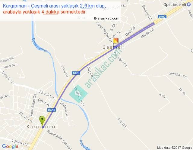 Kargıpınarı - Çeşmeli arası yaklaşık olarak 90 km/h ile yukarıda belirtilen sürede olup, iki yerin kuş uçuşu uzaklığı (mesafesi) 1'dir. Yolculuk otobüsle 5 dakika sürmektedir.