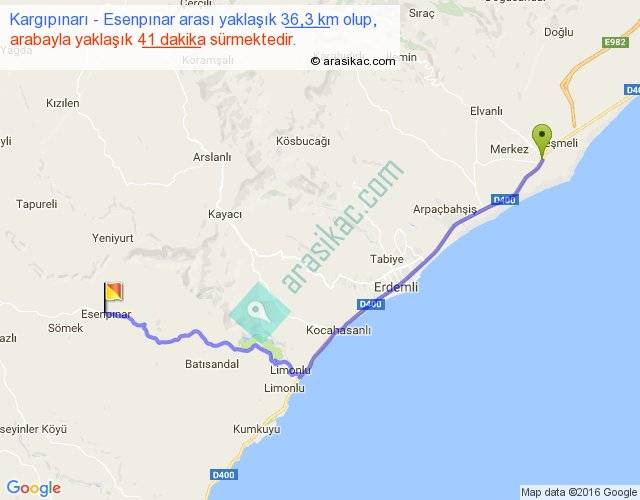 Kargıpınarı - Esenpınar arası yaklaşık olarak 90 km/h ile yukarıda belirtilen sürede olup, iki yerin kuş uçuşu uzaklığı (mesafesi) 28'dir. Yolculuk otobüsle 53 dakika sürmektedir.