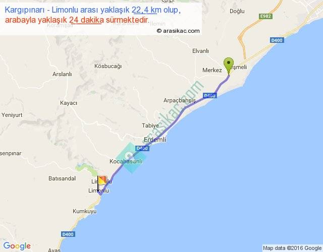 Kargıpınarı - Limonlu arası yaklaşık olarak 90 km/h ile yukarıda belirtilen sürede olup, iki yerin kuş uçuşu uzaklığı (mesafesi) 21'dir. Yolculuk otobüsle 31 dakika sürmektedir.
