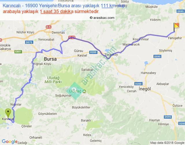 Karıncalı - 16900 Yenişehir Bursa arası yaklaşık olarak 90 km/h ile yukarıda belirtilen sürede olup, iki yerin kuş uçuşu uzaklığı (mesafesi) 75'dir. Yolculuk otobüsle 2 saat 3 dakika sürmektedir.