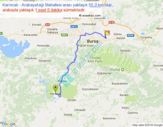 Karıncalı - Arabayatağı Mahallesi arası yaklaşık olarak 90 km/h ile yukarıda belirtilen sürede olup, iki yerin kuş uçuşu uzaklığı (mesafesi) 34'dir. Yolculuk otobüsle 1 saat 18 dakika sürmektedir.