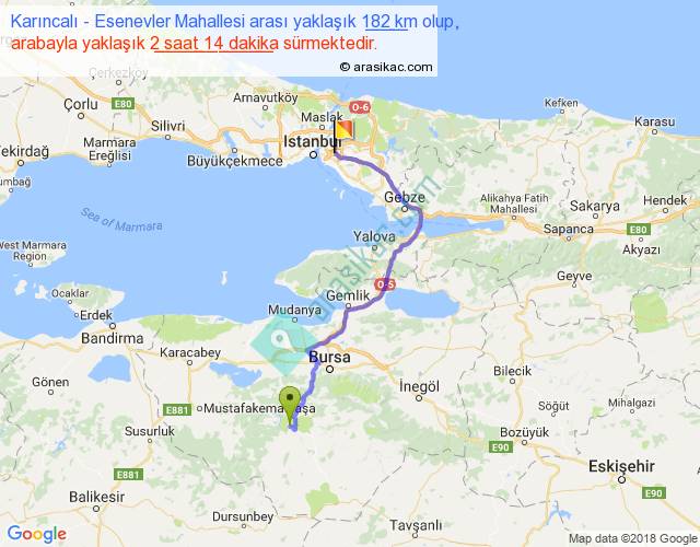 Karıncalı - Esenevler Mahallesi arası yaklaşık olarak 90 km/h ile yukarıda belirtilen sürede olup, iki yerin kuş uçuşu uzaklığı (mesafesi) 117'dir. Yolculuk otobüsle 2 saat 54 dakika sürmektedir.