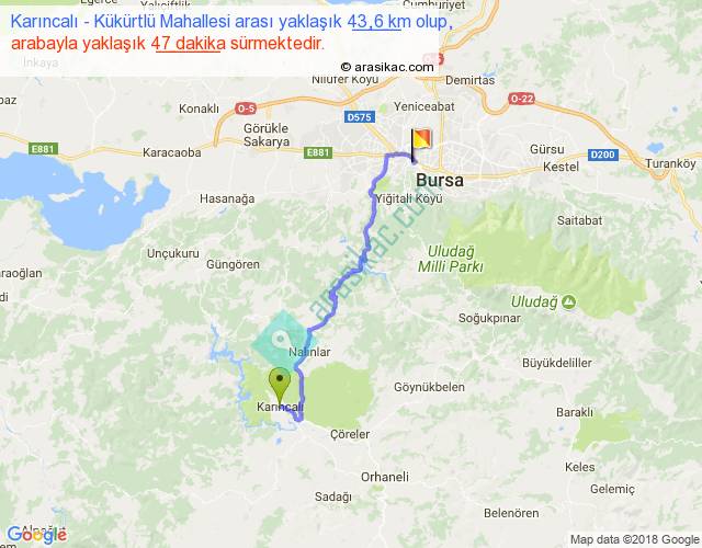 Karıncalı - Kükürtlü Mahallesi arası yaklaşık olarak 90 km/h ile yukarıda belirtilen sürede olup, iki yerin kuş uçuşu uzaklığı (mesafesi) 29'dir. Yolculuk otobüsle 1 saat 1 dakika sürmektedir.