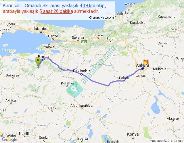 Karıncalı - Orhaneli Sk. arası yaklaşık olarak 90 km/h ile yukarıda belirtilen sürede olup, iki yerin kuş uçuşu uzaklığı (mesafesi) 342'dir. Eğer belirtilen yerler arasında uçak seferi var ise bu süre uçakla 31 dakika'ya kadar düşebilir. Yolculuk otobüsle 7 saat 3 dakika sürmektedir.