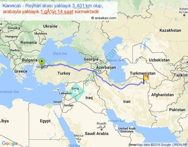 Karıncalı - Reyhan arası yaklaşık olarak 90 km/h ile yukarıda belirtilen sürede olup, iki yerin kuş uçuşu uzaklığı (mesafesi) 2666'dir. Eğer belirtilen yerler arasında uçak seferi var ise bu süre uçakla 4 saat 06 dakika'ya kadar düşebilir. Yolculuk otobüsle 2 gün 1 saat sürmektedir.