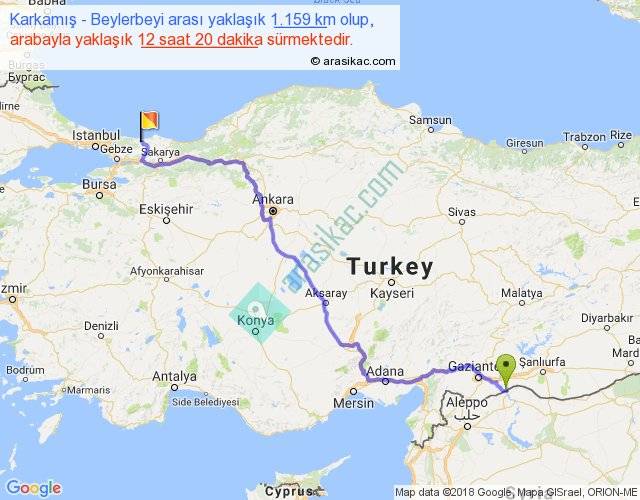 Karkamış - Beylerbeyi arası yaklaşık olarak 90 km/h ile yukarıda belirtilen sürede olup, iki yerin kuş uçuşu uzaklığı (mesafesi) 832'dir. Eğer belirtilen yerler arasında uçak seferi var ise bu süre uçakla 1 saat 16 dakika'ya kadar düşebilir. Yolculuk otobüsle 16 saat 2 dakika sürmektedir.