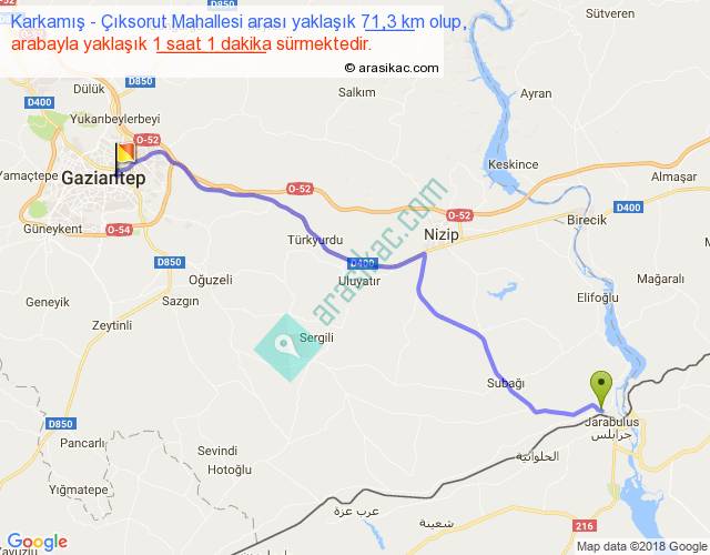 Karkamış - Çıksorut Mahallesi arası yaklaşık olarak 90 km/h ile yukarıda belirtilen sürede olup, iki yerin kuş uçuşu uzaklığı (mesafesi) 59'dir. Yolculuk otobüsle 1 saat 19 dakika sürmektedir.