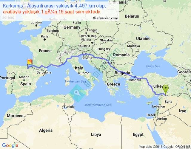 Karkamış - Álava ili arası yaklaşık olarak 90 km/h ile yukarıda belirtilen sürede olup, iki yerin kuş uçuşu uzaklığı (mesafesi) 3482'dir. Eğer belirtilen yerler arasında uçak seferi var ise bu süre uçakla 5 saat 21 dakika'ya kadar düşebilir. Yolculuk otobüsle 2 gün 7 saat sürmektedir.