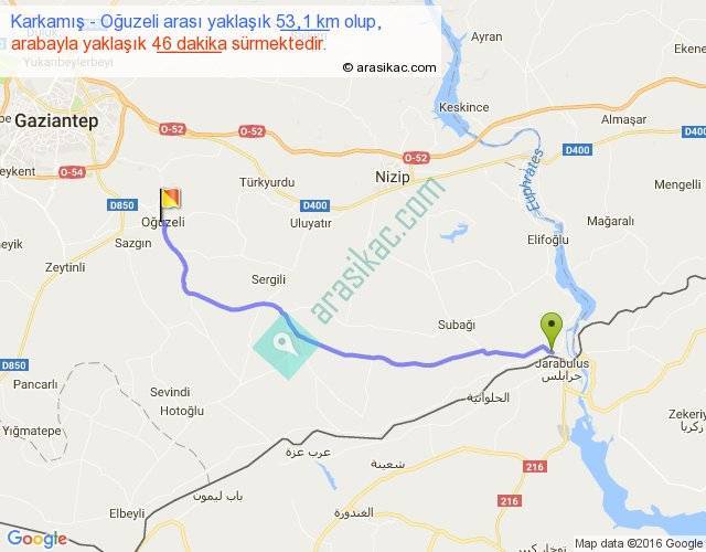 Karkamış - Oğuzeli arası yaklaşık olarak 90 km/h ile yukarıda belirtilen sürede olup, iki yerin kuş uçuşu uzaklığı (mesafesi) 45'dir. Yolculuk otobüsle 59 dakika sürmektedir.