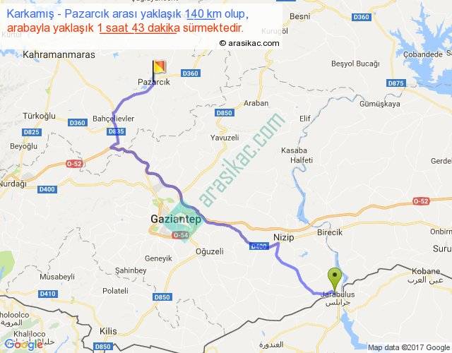 Karkamış - Pazarcık arası yaklaşık olarak 90 km/h ile yukarıda belirtilen sürede olup, iki yerin kuş uçuşu uzaklığı (mesafesi) 95'dir. Yolculuk otobüsle 2 saat 13 dakika sürmektedir.