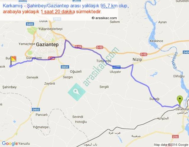 Karkamış - Şahinbey Gaziantep arası yaklaşık olarak 90 km/h ile yukarıda belirtilen sürede olup, iki yerin kuş uçuşu uzaklığı (mesafesi) 71'dir. Yolculuk otobüsle 1 saat 44 dakika sürmektedir.