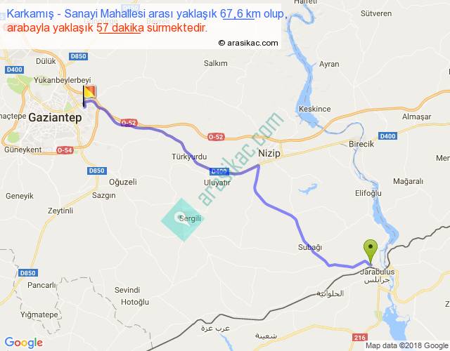 Karkamış - Sanayi Mahallesi arası yaklaşık olarak 90 km/h ile yukarıda belirtilen sürede olup, iki yerin kuş uçuşu uzaklığı (mesafesi) 56'dir. Yolculuk otobüsle 1 saat 14 dakika sürmektedir.