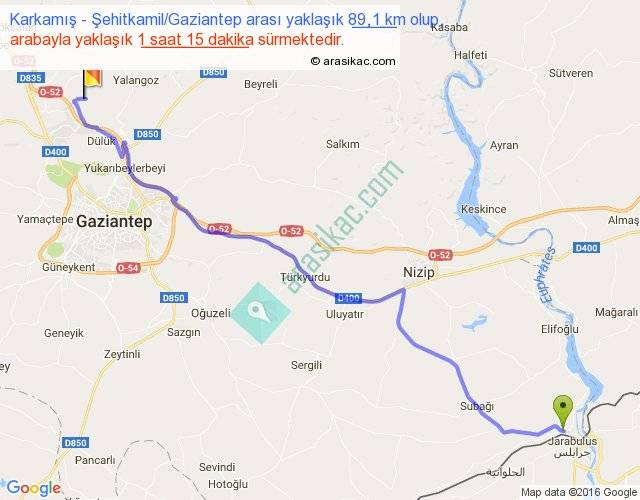 Karkamış - Şehitkamil Gaziantep arası yaklaşık olarak 90 km/h ile yukarıda belirtilen sürede olup, iki yerin kuş uçuşu uzaklığı (mesafesi) 71'dir. Yolculuk otobüsle 1 saat 37 dakika sürmektedir.