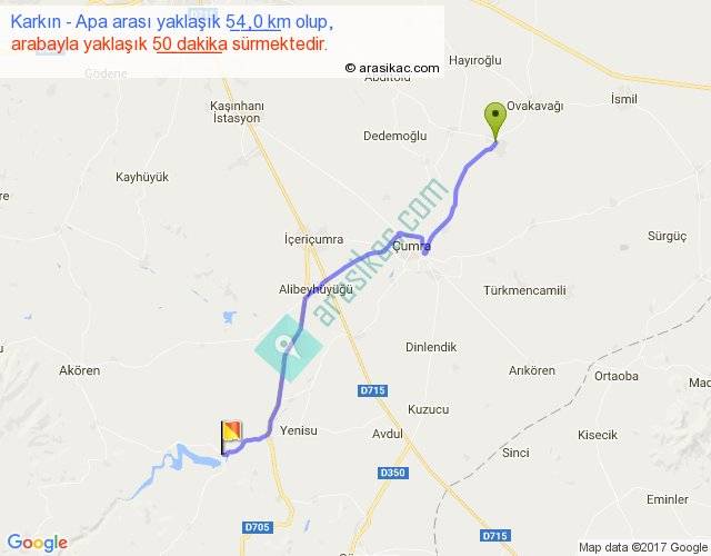 Karkın - Apa arası yaklaşık olarak 90 km/h ile yukarıda belirtilen sürede olup, iki yerin kuş uçuşu uzaklığı (mesafesi) 45'dir. Yolculuk otobüsle 1 saat 5 dakika sürmektedir.