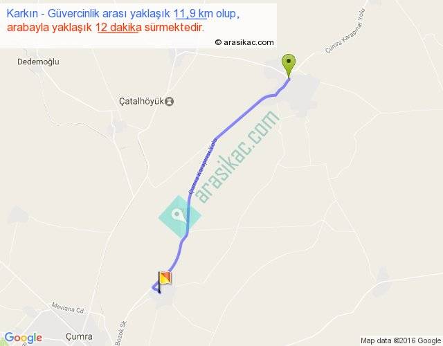 Karkın - Güvercinlik arası yaklaşık olarak 90 km/h ile yukarıda belirtilen sürede olup, iki yerin kuş uçuşu uzaklığı (mesafesi) 11'dir. Yolculuk otobüsle 15 dakika sürmektedir.