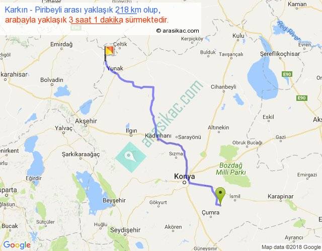 Karkın - Piribeyli arası yaklaşık olarak 90 km/h ile yukarıda belirtilen sürede olup, iki yerin kuş uçuşu uzaklığı (mesafesi) 174'dir. Yolculuk otobüsle 3 saat 55 dakika sürmektedir.